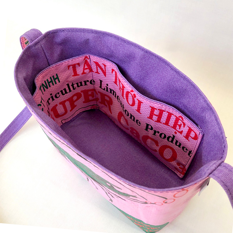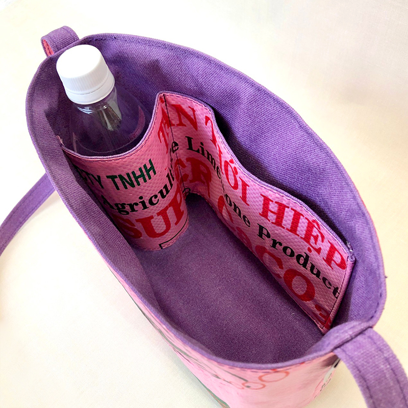 内側にもさりげないお洒落をと、飼料袋を施した帆布ポケットを付け、サイドに行くとペットボトルホルダーへと変わります。使用しない時は平に納められるのでバッグの容量を確保できます。