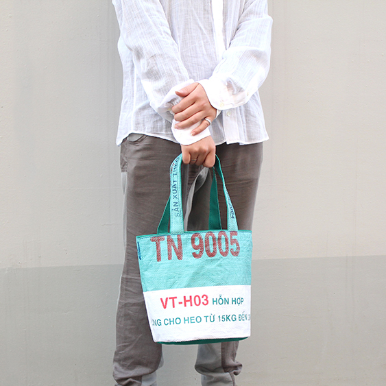 底が楕円型の小さめなトートバッグです。 バッグ本体は小さめですが、ハンドルは長めに設定されているので肩からかけることが可能になっています。 ++ POINT ++ ・パッチワーク 飼料袋をはぎ合わせた作りになっています。 ・内ポケット 携帯などの小物がしっかり入る、内ポケットがついています。 ++ SIZE ++ 縦:24cm 横:21cm マチ:17cm