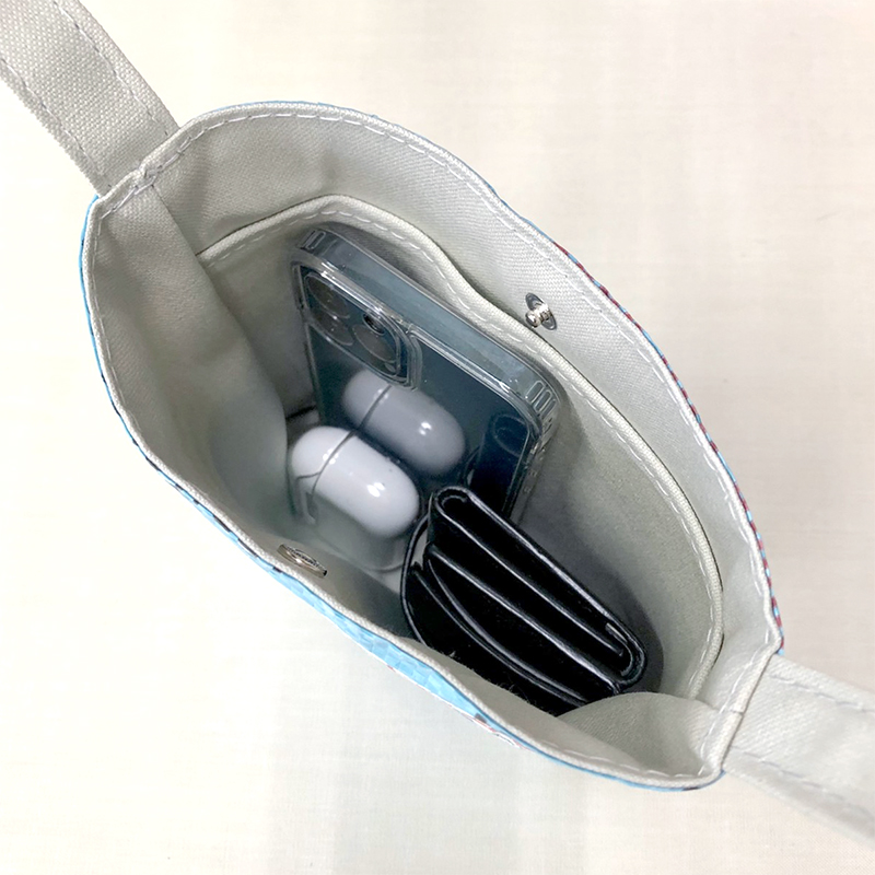 首から掛けたり、斜め掛けしたりと、最低限の持ち物で手軽にお出掛けできるコンパクトな縦長ミニショルダーバッグです。
